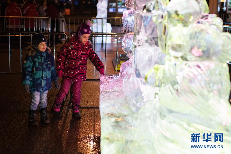 12月24日,在俄羅斯首都莫斯科,小朋友們與冰雕合影。 新華社記者 白雪騏 攝