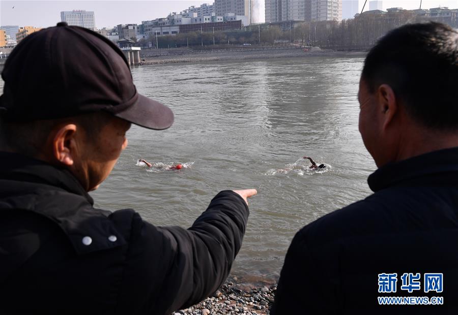 12月19日,冬泳愛好者趙西普(右)在黃河冬泳。新華社記者陳斌攝