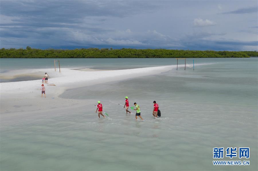 12月8日,在印度尼西亞邦加勿里洞省,李嘉文(右二)帶領(lǐng)工人在李王島的白色海床清理垃圾。(無(wú)人機(jī)拍攝) 新華社記者杜宇攝