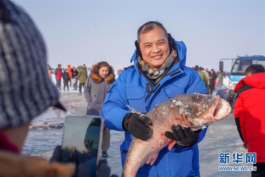 12月27日,在查干湖冰面上,游客手捧剛打撈上來(lái)的大魚拍照留念。新華社記者張楠攝