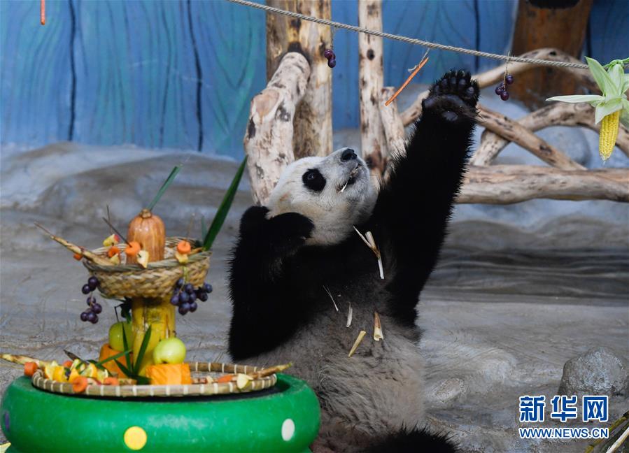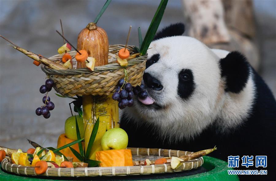 當日是2019年最后一天,海南熱帶野生動植物園的工作人員為園區(qū)內大熊貓“貢貢”“舜舜”準備了用葡萄、南瓜、竹筍等果蔬制作的“火鍋串串香”,讓它們用“擼串”的方式迎接新年的到來。 新華社記者 楊冠宇 攝