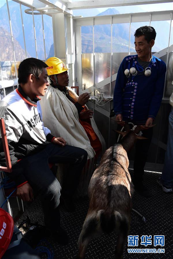 12月31日,阿布洛哈村村民吉爾牛日(右)拉著一頭羊乘坐擺渡車出村。新華社記者江宏景攝