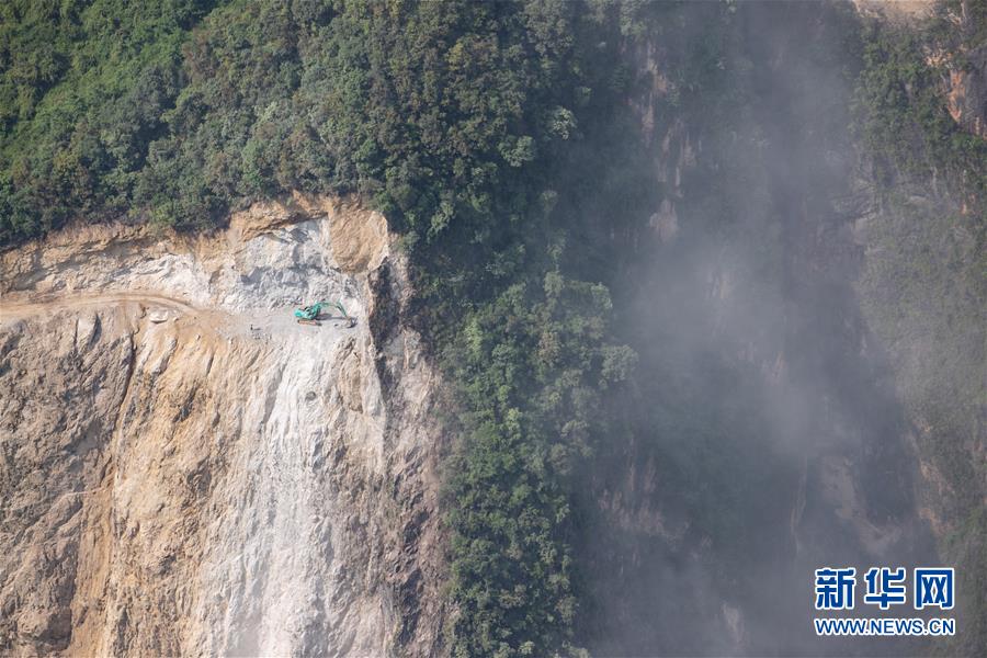 一輛挖掘機(jī)在阿布洛哈村懸崖修建通村公路(2019年7月18日攝)。新華社記者江宏景攝