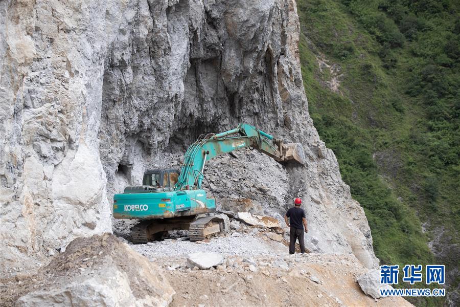 通村公路的施工人員在阿布洛哈村陡崖夾溝地勢(shì)中作業(yè)(2019年7月18日攝)。新華社記者江宏景攝