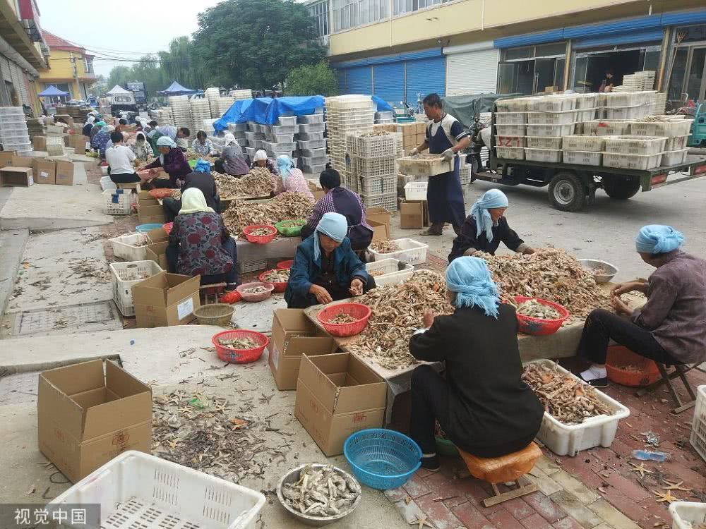 渤海灣畔海產(chǎn)豐收,成群魚蝦分揀后當(dāng)街晾曬,場面賽曬糧食