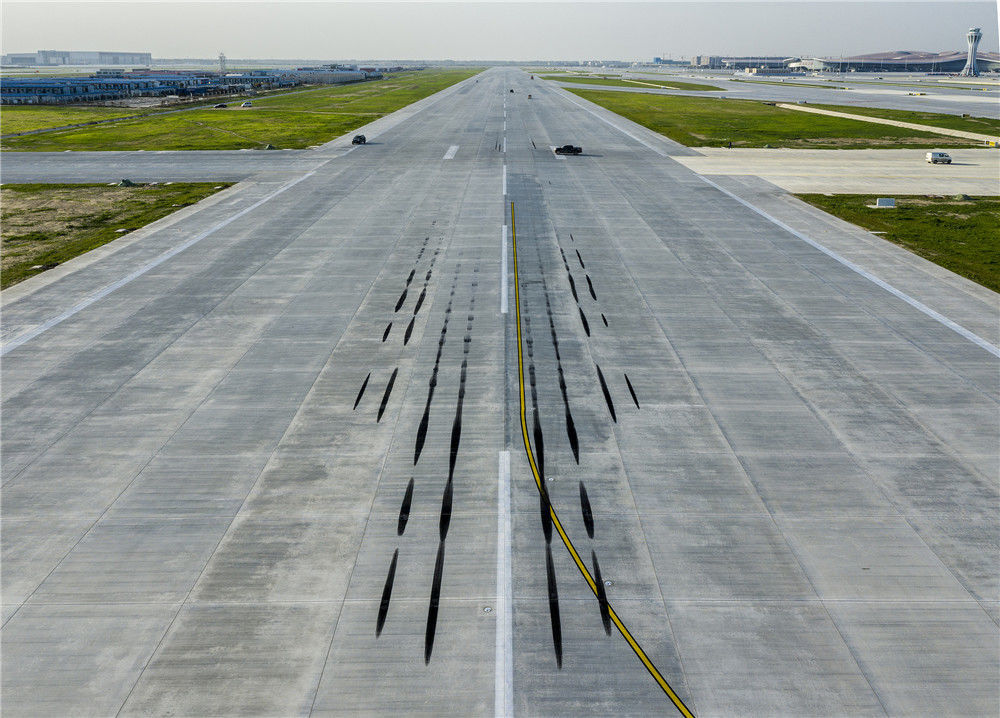 2019年5月29日,北京大興國(guó)際機(jī)場(chǎng),飛機(jī)在跑道上留下的痕跡。馬文曉/視覺中國(guó)