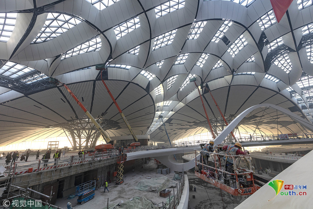 2018年12月19日,北京大興國際機(jī)場(chǎng)航站樓的室內(nèi)裝修在有條不紊的推進(jìn)中。視覺中國