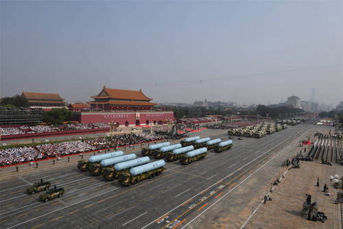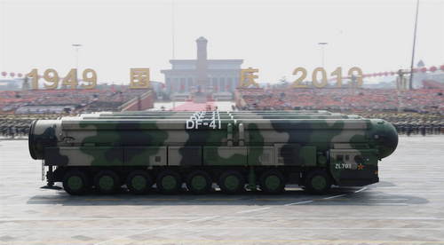 2019年10月1日,慶祝中華人民共和國(guó)成立70周年大會(huì)在北京天安門(mén)廣場(chǎng)隆重舉行。這是東風(fēng)-41核導(dǎo)彈方隊(duì)接受檢閱。新華社記者劉彬攝