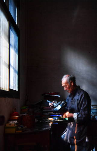 2019年10月12日,在江西省鄱陽(yáng)縣鄱陽(yáng)鎮(zhèn),76歲的“鄱陽(yáng)脫胎漆器髹飾技藝”國(guó)家級(jí)非物質(zhì)文化遺產(chǎn)代表性傳承人丁國(guó)坤在家中為一件未成形的脫胎漆器“上漆”。新華社記者胡晨歡攝