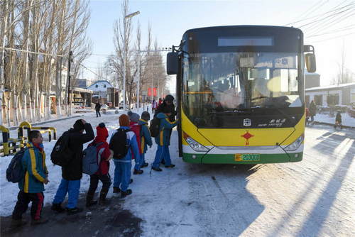 2019年12月18日,在新疆伊犁哈薩克自治州察布查爾錫伯自治縣海努克鄉(xiāng)阿熱吾斯塘村小學(xué),學(xué)生排隊(duì)登上“校車專線”。新華社記者丁磊攝