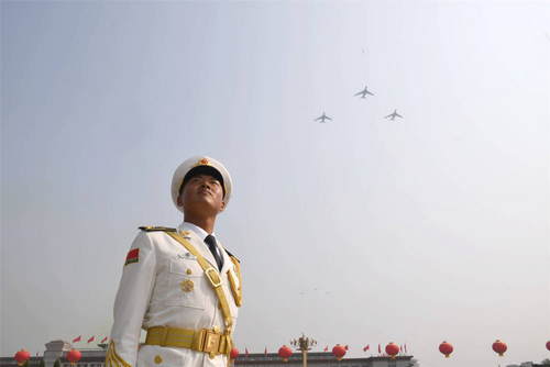 2019年10月1日,慶祝中華人民共和國(guó)成立70周年大會(huì)在北京天安門廣場(chǎng)隆重舉行。這是空中梯隊(duì)飛過天安門上空。新華社記者金良快攝