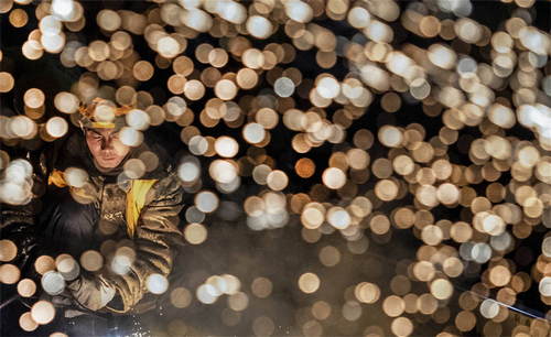 2019年1月15日凌晨,中鐵十一局施工人員在陜西省西安火車站改擴(kuò)建工程現(xiàn)場(chǎng)切割鋼軌。新華社記者陶明攝