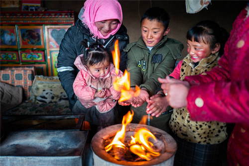 2019年1月17日,西藏班戈縣尼瑪鄉(xiāng)牧民齊美一家在冬季牧民定居點(diǎn)烤火。新華社記者普布扎西攝