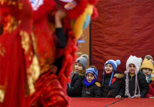 2019年2月19日,小朋友在新疆烏魯木齊大巴扎步行街觀看元宵節(jié)舞獅表演。新華社記者王菲攝