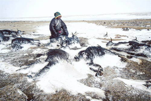 2019年2月23日,青海省玉樹(shù)藏族自治州稱多縣扎朵鎮(zhèn)治多村牧民坐在自家被凍死的牦牛前。2018年12月下旬以來(lái),玉樹(shù)州境內(nèi)多次大范圍降雪,部分地區(qū)遭受重度、特重度雪災(zāi)。 新華社記者吳剛攝