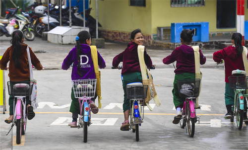 2019年3月8日,在云南省瑞麗市姐相鄉(xiāng)銀井村,銀井小學(xué)幾名緬籍學(xué)生騎車回家,跨過(guò)銀井邊防口岸國(guó)境線。每天清晨,都有一群孩子通過(guò)銀井邊防站,從緬甸來(lái)到瑞麗市銀井小學(xué)讀書。新華社記者李曉果攝