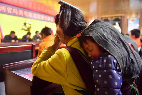 2019年3月14日,一名婦女背著小孩參加烏英苗寨脫貧產(chǎn)業(yè)會(huì)議。烏英苗寨位于桂黔交界的大苗山深處,共有140戶600多人,其中100戶屬?gòu)V西柳州市融水苗族自治縣桿洞鄉(xiāng)黨鳩村,40戶屬貴州省從江縣翠里瑤族壯族鄉(xiāng)南岑村。這里交通不便,土地資源匱乏,自然環(huán)境惡劣,曾經(jīng)是一個(gè)極度貧困的苗寨。2019年,全寨共有44戶貧困戶實(shí)現(xiàn)脫貧,貧困戶已從2016年的92戶減少到目前的4戶。新華社記者黃孝邦攝