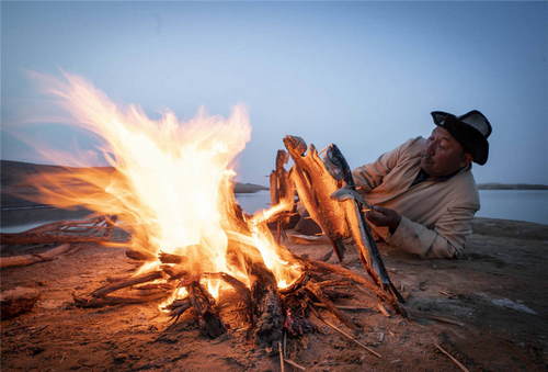 2019年4月11日,在新疆尉犁縣羅布人村寨里,羅布人阿木東·艾不東在塔里木河畔烤魚。新華社記者趙戈攝