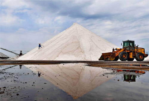 2019年7月3日,河北唐山海港經(jīng)濟(jì)開發(fā)區(qū)大清河鹽場(chǎng)的工人在洗鹽場(chǎng)工作。新華社記者楊世堯攝