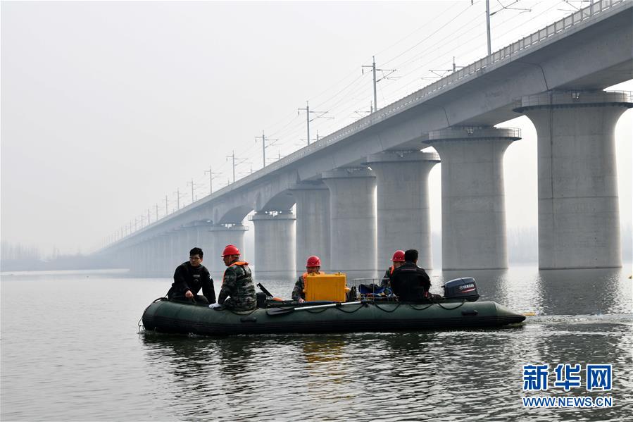 1月3日,中國鐵路濟南局鐵道戰(zhàn)備舟橋處工程人員準備船只前往預(yù)定地點檢查橋墩。