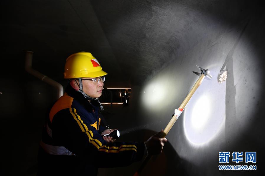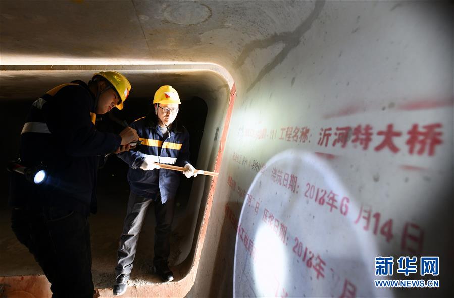 1月3日,中國鐵路濟南局臨沂工務(wù)段工程技術(shù)員在沂河特大橋箱梁內(nèi)檢查。新華社記者 朱崢攝