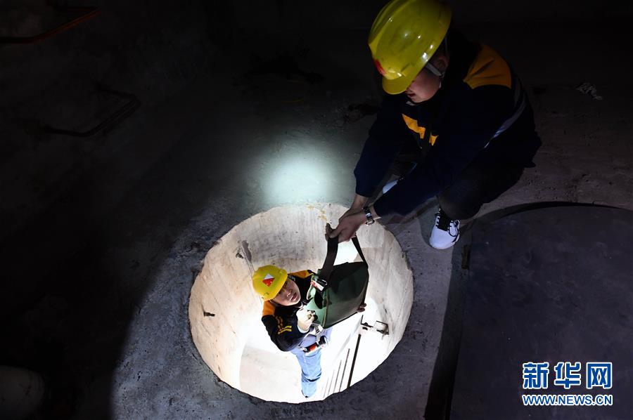 1月3日,中國鐵路濟南局臨沂工務(wù)段工程技術(shù)員通過狹小的檢查孔進入箱梁檢查。新華社記者 朱崢攝