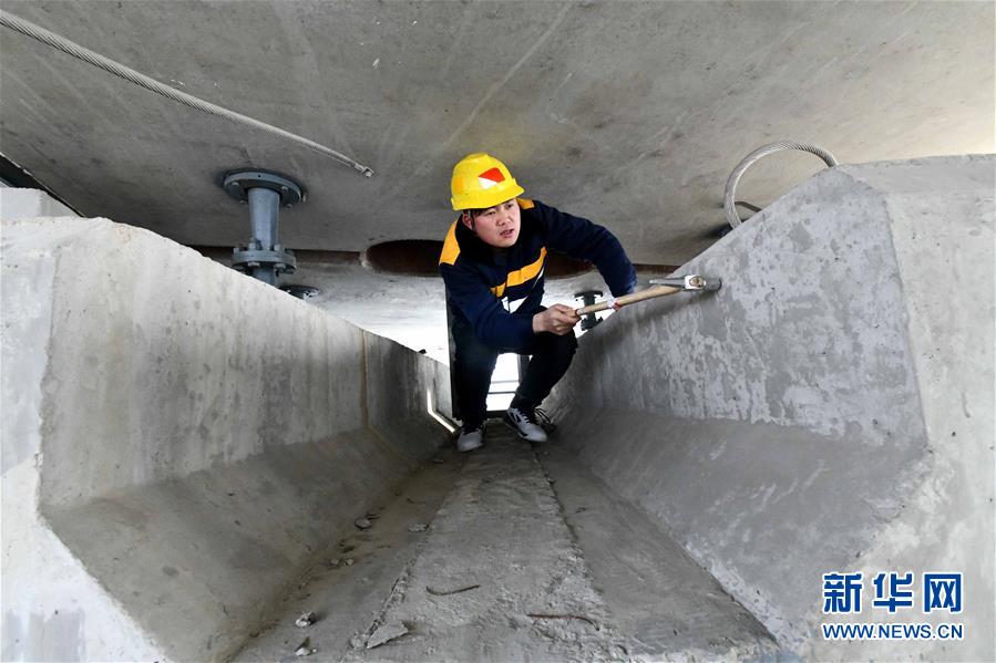 1月3日,中國鐵路濟南局臨沂工務段工程技術員李奔騰在沂河特大橋橋梁連接處檢查。新華社記者 朱崢攝