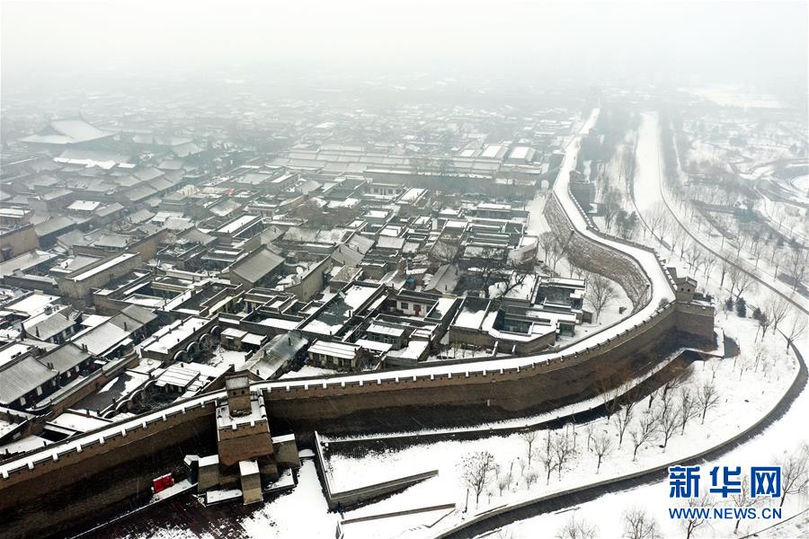 1月5日拍攝的平遙古城城墻與護城河(無人機照片)。新華社記者詹彥攝