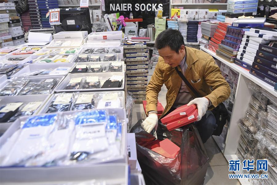 冉光輝在重慶朝天門大正商場內(nèi)整理即將搬運的貨物(1月5日攝)。新華社記者王全超攝