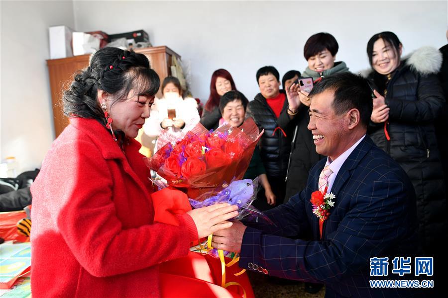 在和順縣李陽(yáng)鎮(zhèn)南李陽(yáng)村,新郎馬愛明將花送給新娘溫麗芳(2019年12月31日攝)。 農(nóng)歷臘月初六,是山西省和順縣李陽(yáng)鎮(zhèn)下石勒村45歲的馬愛明娶媳婦的日子。 地處太行山區(qū)的下石勒村曾深陷貧困,“地下無(wú)資源、地上沒產(chǎn)業(yè)”是這里的真實(shí)寫照。2013年,村里638口人中有511口屬貧困人口。村民在貧瘠的坡地上種的玉米、谷子等僅夠糊口,外村女子都不愿嫁到這里。和村里多數(shù)人一樣,貧困戶馬愛明不得不在農(nóng)閑時(shí)出去打工補(bǔ)貼家用。東走走、西走走,馬愛明沒攢下錢,也沒遇見合適的人,婚事一拖再拖,成了大齡“光棍”。 2013年以來(lái),在國(guó)家強(qiáng)有力的政策幫扶和基層黨組織的帶領(lǐng)下,下石勒村以合作社的形式發(fā)展起肉牛養(yǎng)殖、雙孢菇種植、萬(wàn)壽菊種植等集體產(chǎn)業(yè)。下石勒村經(jīng)濟(jì)有了起色,外出打工的村民紛紛回村。馬愛明加入了村里的建筑隊(duì),閑時(shí)還到種植專業(yè)合作社打工,一年四季都有活干。加上土地流轉(zhuǎn)的收入,馬愛明一年能收入三萬(wàn)多元。2016年,下石勒村實(shí)現(xiàn)整村脫貧。 2019年,馬愛明結(jié)識(shí)了在下石勒村肉雞養(yǎng)殖專業(yè)合作社打工的李陽(yáng)鎮(zhèn)南李陽(yáng)村村民溫麗芳,馬愛明的樸實(shí)、善良、勤勞打動(dòng)了溫麗芳,兩人擦出了愛情的火花。 臘月初六這天,下石勒村鑼鼓喧天,嗩吶齊鳴。在鄉(xiāng)親們的見證下,馬愛明手牽新娘,大聲宣布:“我脫單了!我的幸福生活開始了!” 新華社記者 詹彥 攝