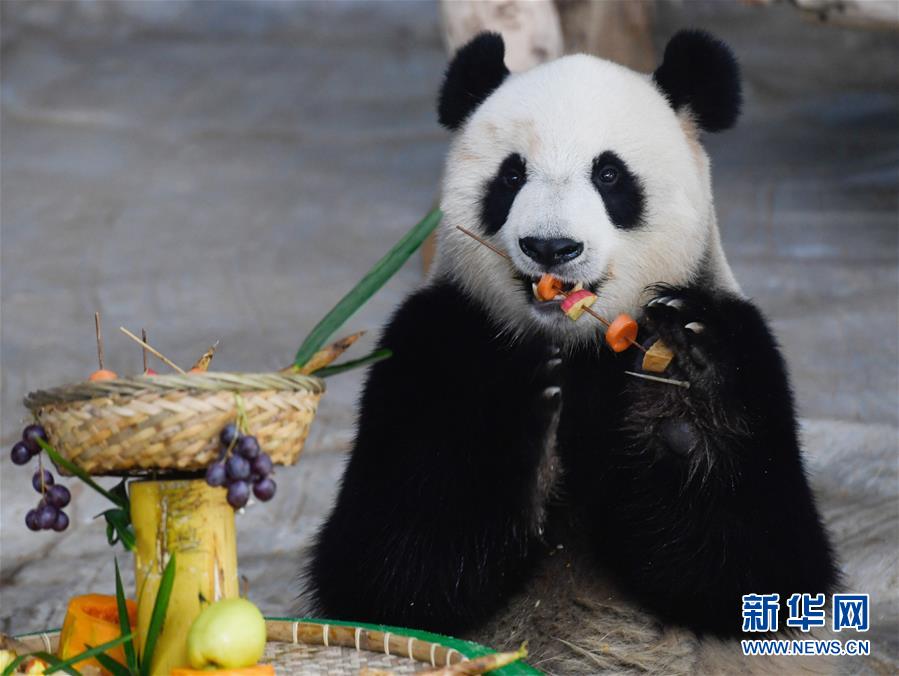 2019年12月31日,大熊貓“貢貢”在“擼串”。 當(dāng)日是2019年最后一天,海南熱帶野生動植物園的工作人員為園區(qū)內(nèi)大熊貓“貢貢”“舜舜”準(zhǔn)備了用葡萄、南瓜、竹筍等果蔬制作的“火鍋串串香”,讓它們用“擼串”的方式迎接新年的到來。 新華社記者 楊冠宇 攝