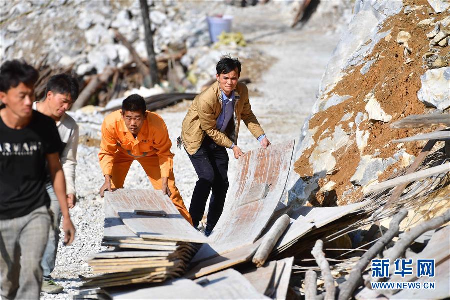 八好村駐村第一書記韋德王(右一)和群眾一起搬運(yùn)木板,準(zhǔn)備修建水柜(2019年12月16日攝)。新華社記者黃孝邦攝