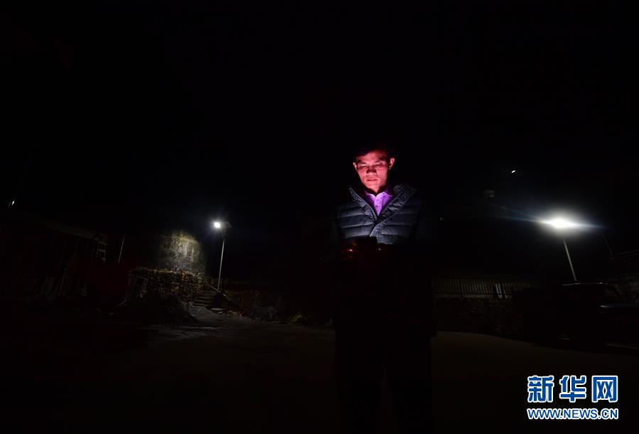 八好村駐村第一書(shū)記韋德王在去貧困戶家走訪途中查看剛剛收到的扶貧信息(1月6日攝)。新華社記者黃孝邦攝