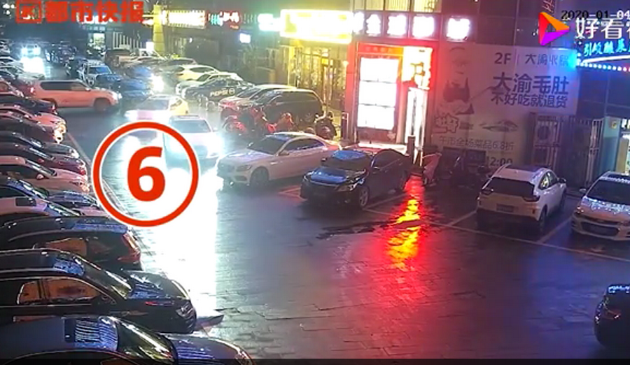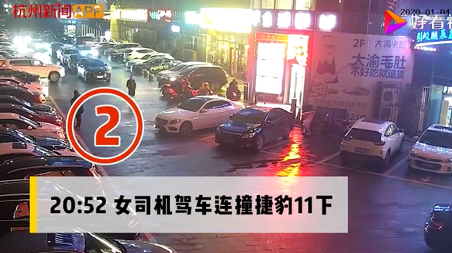 通過監(jiān)控發(fā)現(xiàn),捷豹車當時并沒有停在停車位上,而是橫著停在停車位前的通道上,正好擋住了停在停車位里面的車輛。晚上8點40左右,一輛白色豐田普拉多越野車被捷豹擋住無法出去,10多分鐘后,司機通過倒車再加速十幾次撞擊捷豹,最終把車輛撞開后駛離現(xiàn)場。