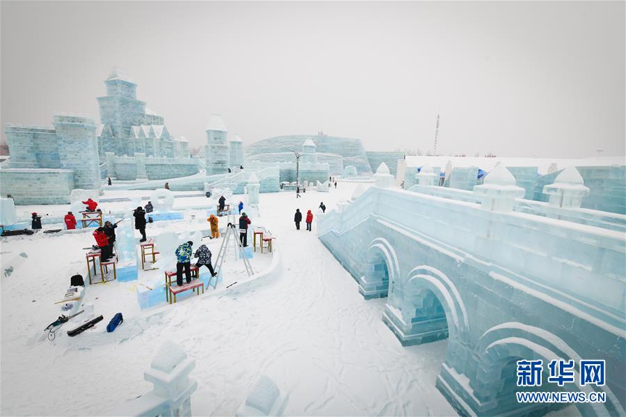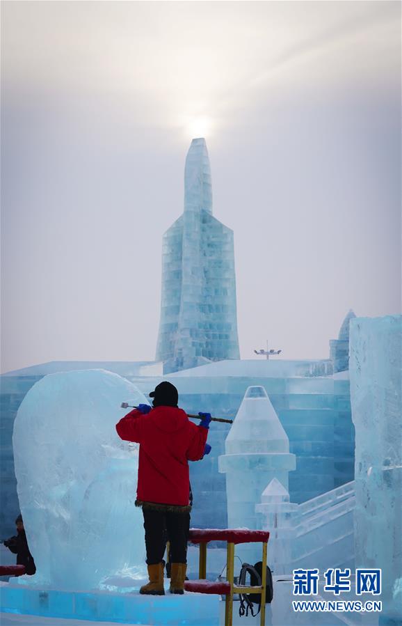 冰雕師在哈爾濱冰雪大世界內(nèi)雕刻冰雕作品(1月8日攝)。新華社記者王松攝