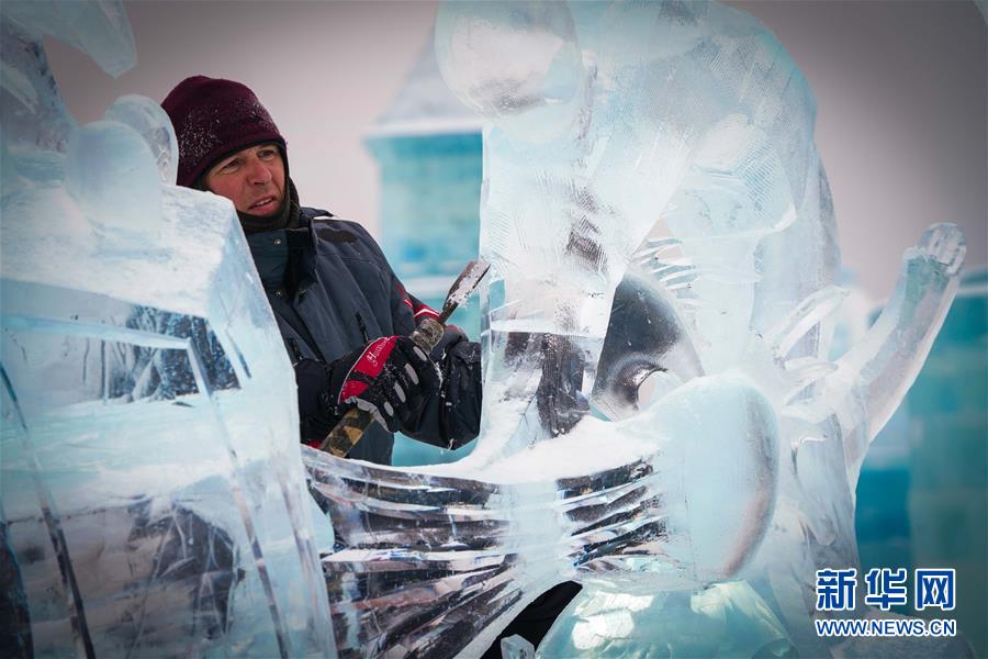 冰雕師在哈爾濱冰雪大世界內(nèi)雕刻冰雕作品(1月8日攝)。新華社記者王松攝
