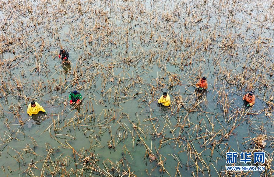 1月10日,村民在磁縣禾下土白蓮藕立體種養(yǎng)基地采收蓮藕(無人機(jī)照片)。
