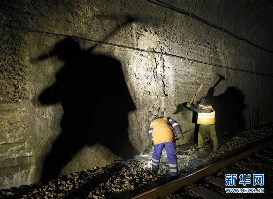 1月9日,在加格達(dá)奇工務(wù)段西羅奇嶺二號(hào)隧道,西羅奇維修工隊(duì)工作人員進(jìn)行隧道除冰作業(yè)。新華社記者王毓國攝