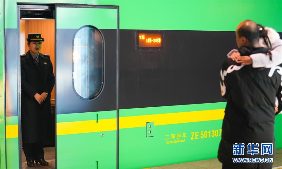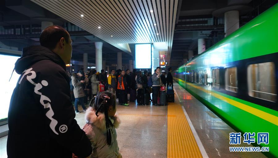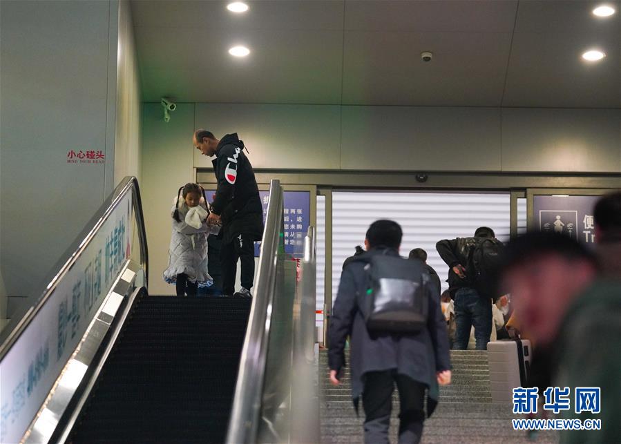 1月3日,卞菁值乘的動車到站,朱梓芮(前右)和父親尋找卞菁的身影。新華社記者 胡晨歡 攝