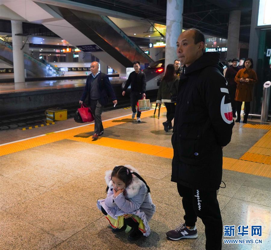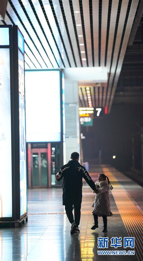 1月3日晚,朱梓芮(左一)在父親朱晨的陪同下前往南昌西站站臺準(zhǔn)備與母親團(tuán)聚。新華社記者 胡晨歡 攝