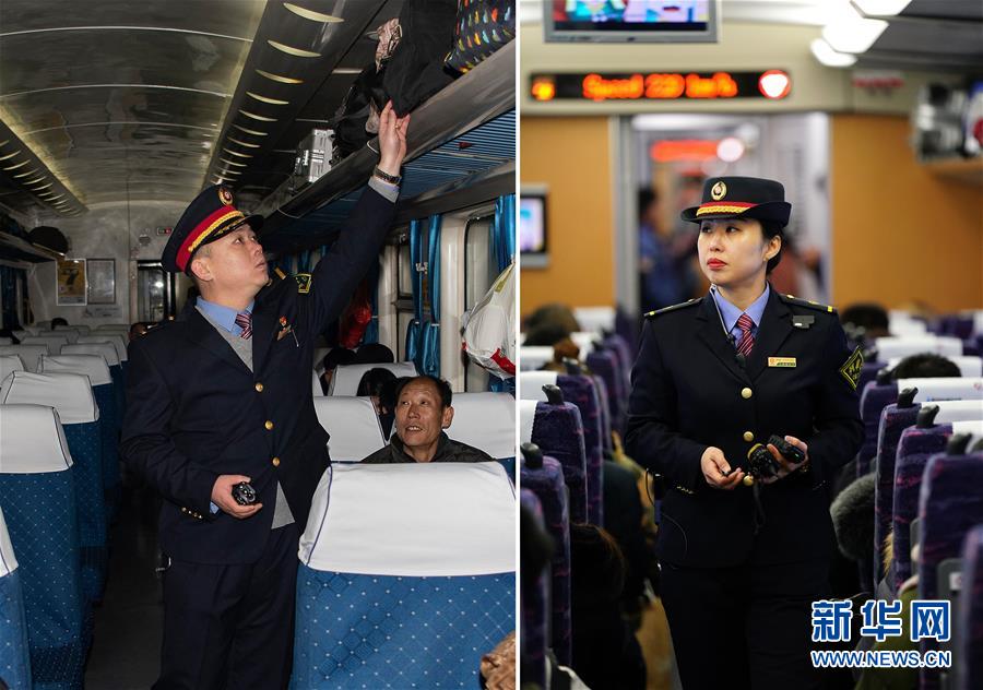 拼版照片左圖:在太原開往青島北的K884次列車上,列車長趙耀在檢查旅客的行李擺放,確保安全(新華社記者楊晨光1月11日攝);右圖:在太原南開往西安北的D2507次列車上,列車長陳海燕在車廂里檢查巡查(新華社記者詹彥1月11日攝)。新華社發(fā)