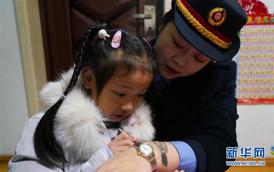 2020年1月3日晚,卞菁值乘從井岡山開往北京西的D734次列車,途經(jīng)南昌西站。思念媽媽的女兒朱梓芮在父親的陪同下,來到南昌西站站臺與卞菁團(tuán)圓,一家三口在站臺度過了8分鐘的團(tuán)聚時(shí)光。 在昏暗的站臺,朱梓芮用水筆將媽媽手上略有些模糊的“手表”重新描繪清晰。隨著鈴聲響起,車門將一家人隔開,列車遠(yuǎn)去,一家人眼眶變得濕潤起來……