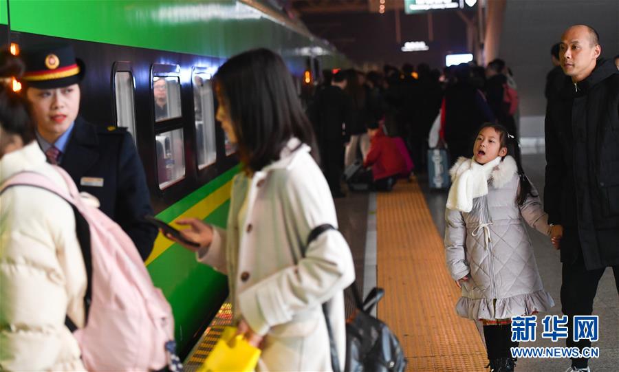 1月3日,卞菁值乘的動(dòng)車到達(dá)南昌西站,朱梓芮(右二)在站臺(tái)邊呼喊正在引導(dǎo)乘客上車的母親。新華社記者 胡晨歡 攝