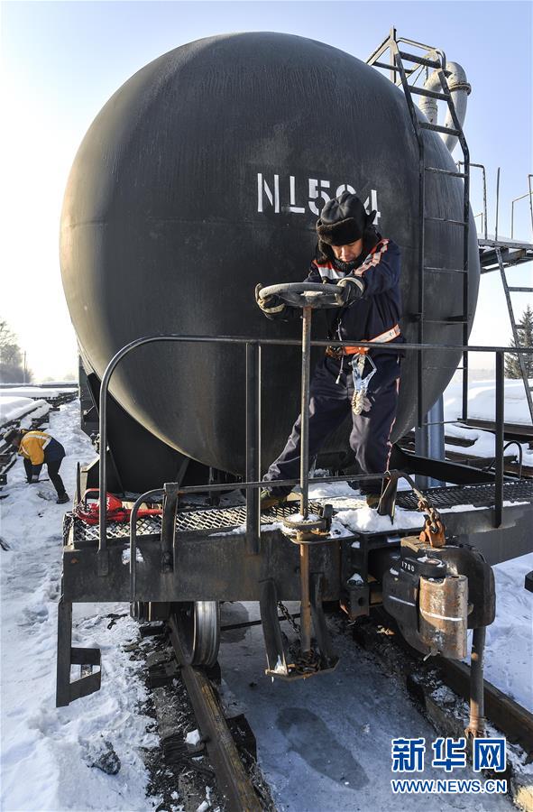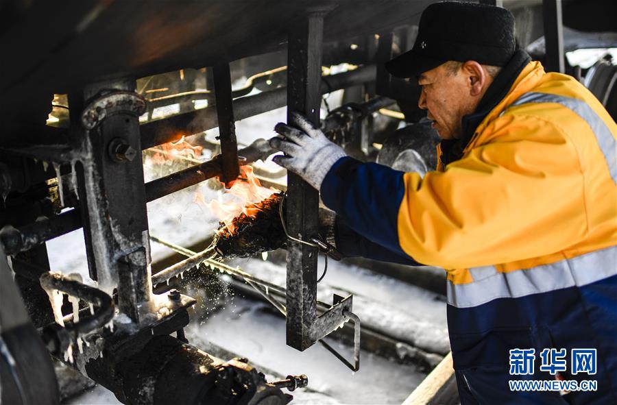 林海間的“送水小火車” 調(diào)車員對“送水小火車”進行出行前的檢查作業(yè)(1月17日攝)。新華社記者 許暢 攝