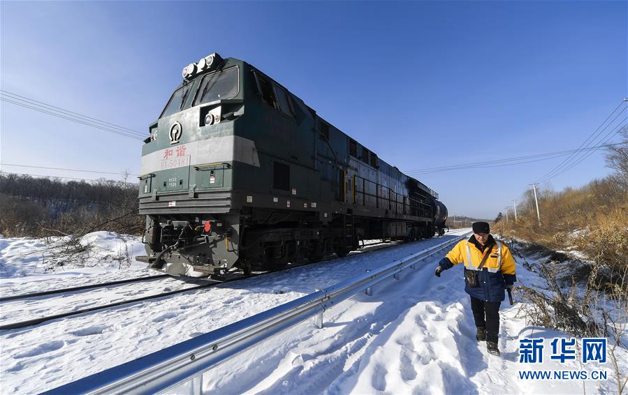 送水員黃衛(wèi)東在雪地中前行,準備登上火車前往送水地點(1月17日攝)。新華社記者 許暢 攝
