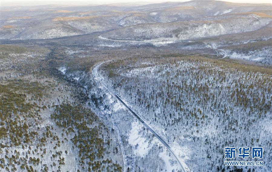 1月6日,一輛列車穿行在西羅奇維修工隊管區(qū)的林海雪原上(無人機(jī)照片)。新華社記者才揚(yáng)攝