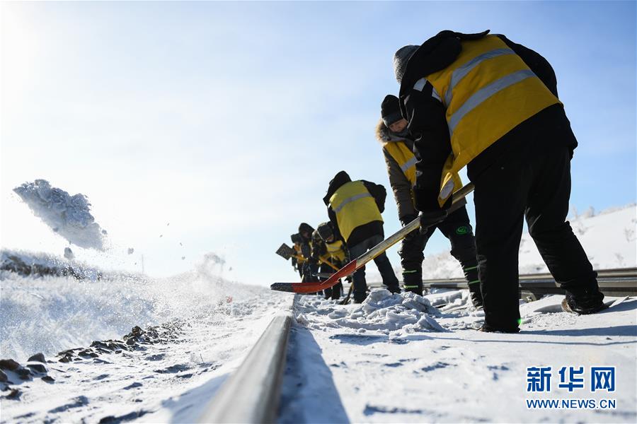 1月13日,白音庫倫綜合維修車間職工在作業(yè)點清理積雪。新華社記者劉磊攝