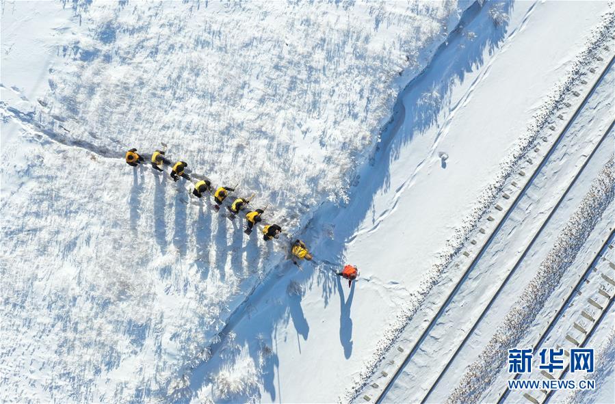 1月7日,西羅奇維修工隊工作人員在雪地上寫下“一路平安”為經(jīng)過的列車旅客送上祝福(無人機(jī)照片)。新華社記者王毓國攝