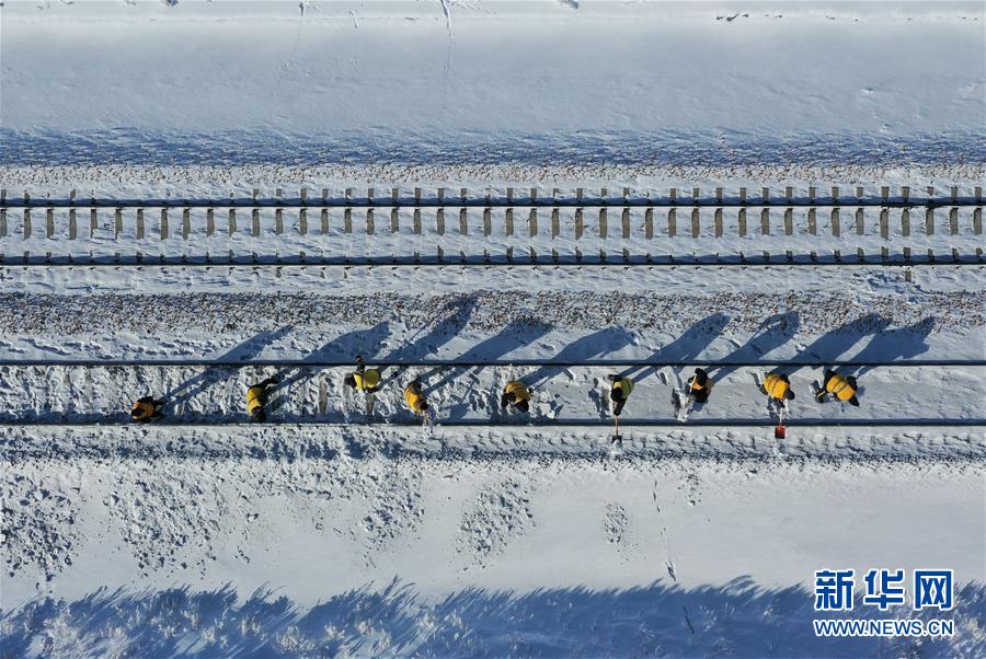 1月13日,白音庫倫綜合維修車間職工在作業(yè)點(diǎn)清理積雪(無人機(jī)照片)。新華社記者劉磊攝
