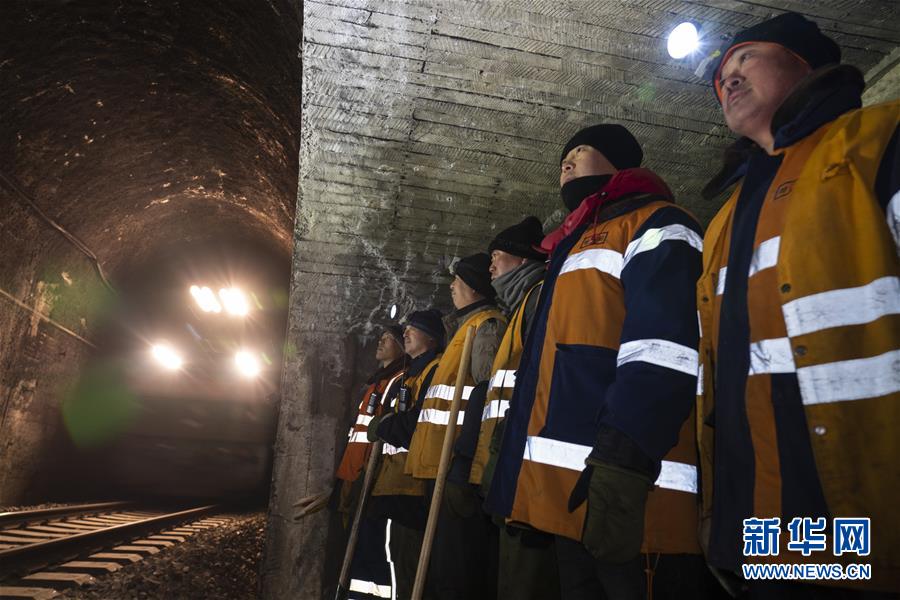 1月7日,在加格達(dá)奇工務(wù)段西羅奇嶺二號(hào)隧道,西羅奇維修工隊(duì)工作人員在避車(chē)洞內(nèi)躲避列車(chē)。新華社記者才揚(yáng)攝